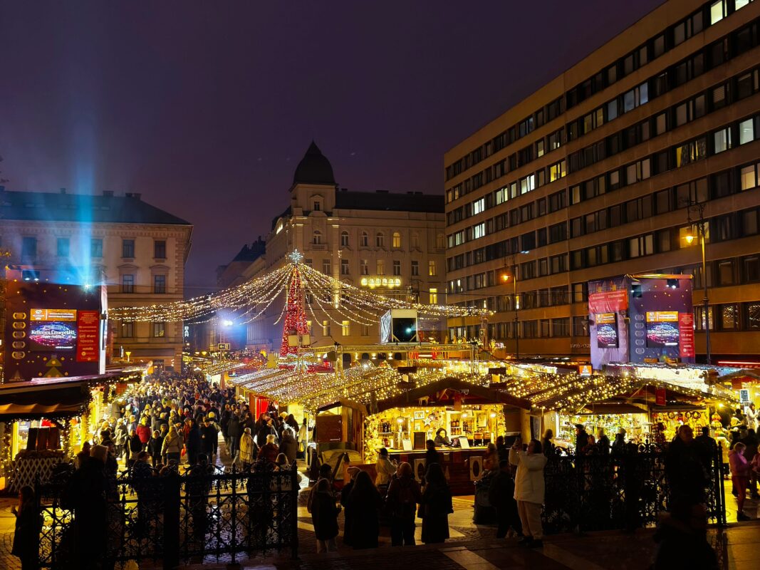 Vörösmarty-pladsen ligger centralt i Budapest og forvandles i adventstiden til en hyggelig julelandsby. Oplyste træboder fylder pladsen, og omkring ståborde står besøgende med varme drikke og nyder stemningen.