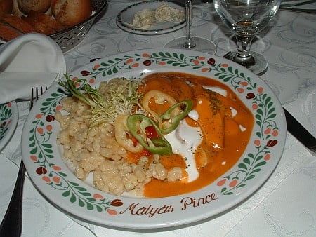 Er lige kommet hjem fra Budapest, hvor vi b.la. var ude og spise på Matyas Pince. Maden var ikke pengene vær. Forretten var god, og suppen kunne spises, men hovedretten bestod af et tyndt (ca 8 mm)kød, som var kørt igennem en nålemaskine, for at gøre det mørt, tilbehøret var helle ikke noget at råbe hurra for. Deserten var noget med svedsker, og da jeg ikke kan lide svedsker, var det heller ikke noget for mig, men det er selvfølgelig en smagssag. Hvis det er dand og sang man vil opleve, er det et udmærket sted, men hold jer fra maden.